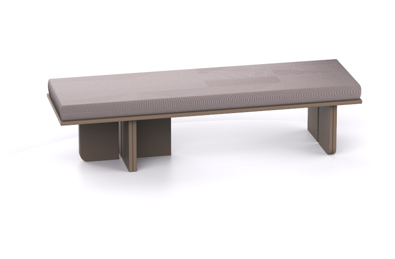 The OvaloBench footboard is defined by clean, well-balanced lines and a subtle sculptural detail at its base. Its name is inspired by the oval opening at the center of the vertical surfaces, which serves as a key aesthetic element, highlighting the geometry of the form while visually reducing the volume of the structure.